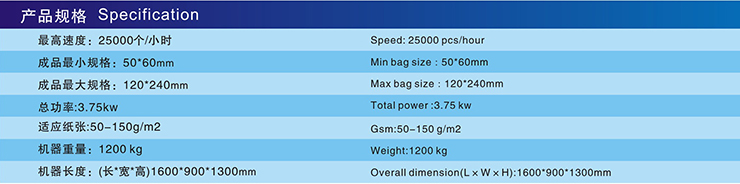 2、配有吸氣滾筒的柵欄定位折疊機構可高速、準確地完成兩次橫折,信封(紙袋)的寬度可不停機調整。